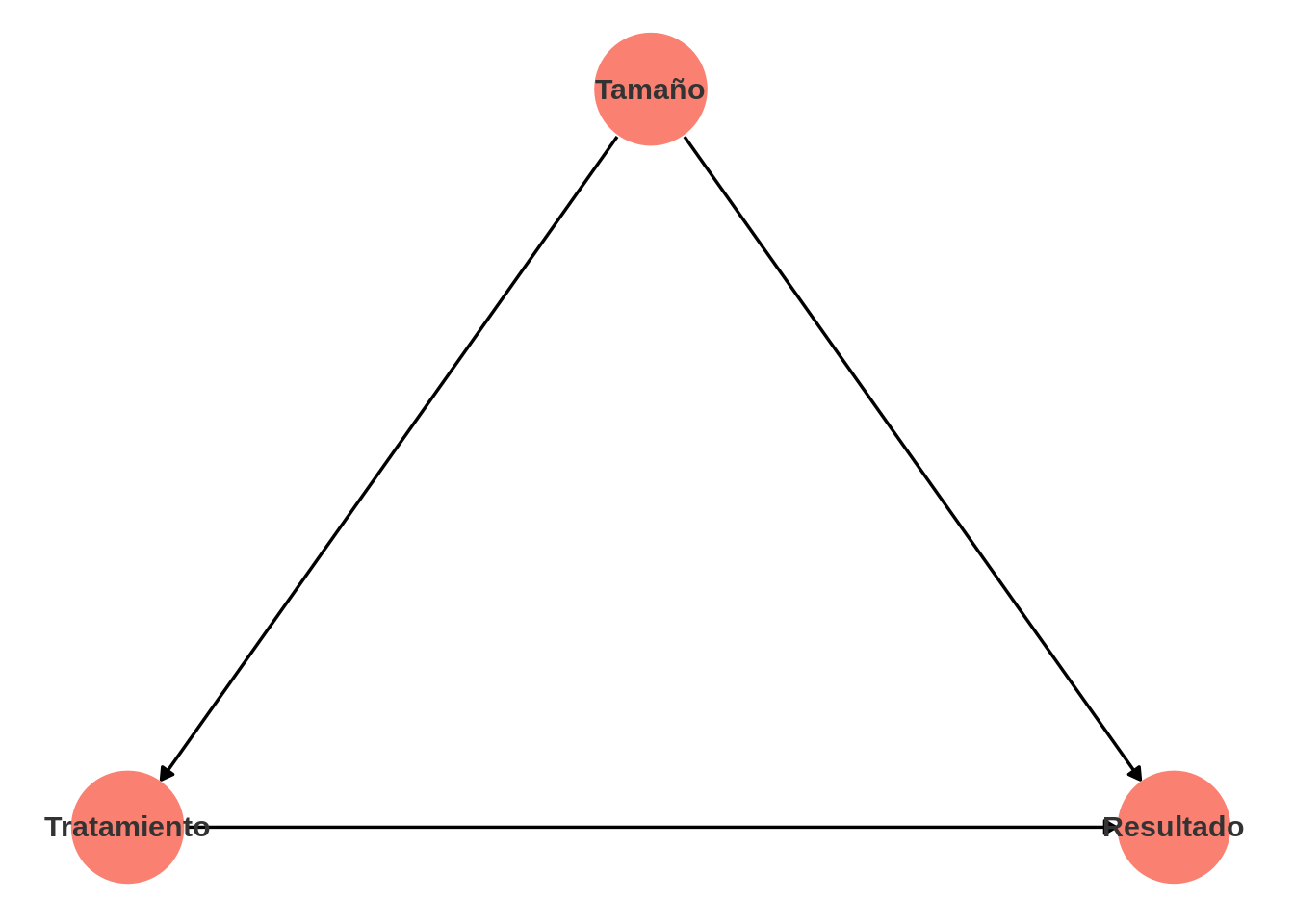 ggplot2::theme_set(ggplot2::theme_light())Podemos utilizar diagramas causales introducidos por Judea Pearl (Pearl, Glymour, y Jewell (2016)) para explicar por qué el análisis se hace de manera diferente en cada uno de los casos de arriba. Los diagramas causales son representaciones de nuestro conocimiento de dominio acerca de cómo se relacionan de manera causal las variables de interés. En el caso de cálculos renales, podemos escribir el diagrama como sigue: