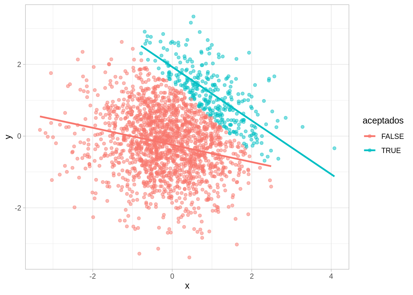 Ahora observamos que aunque en la población general no hay tal relación, al seleccionar sólo a los alumnos de la universidad “activamos” una correlación debido al proceso de selección: