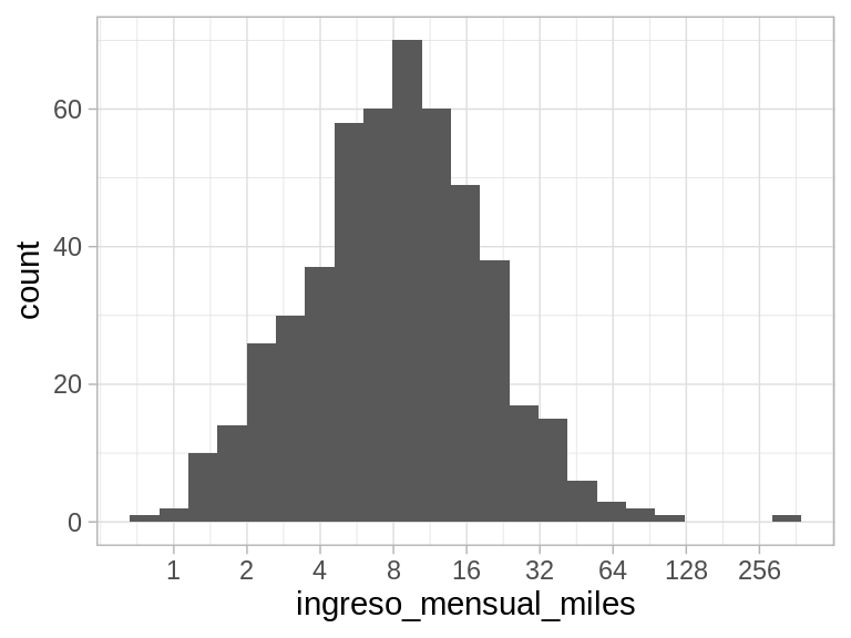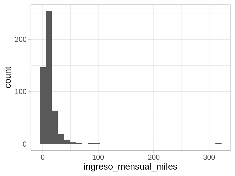 Nótese que la media de estos datos no es un resúmen muy útil, porque es difícil de interpretar. Por los valores grandes, la media es considerablemente más alta que la mediana: