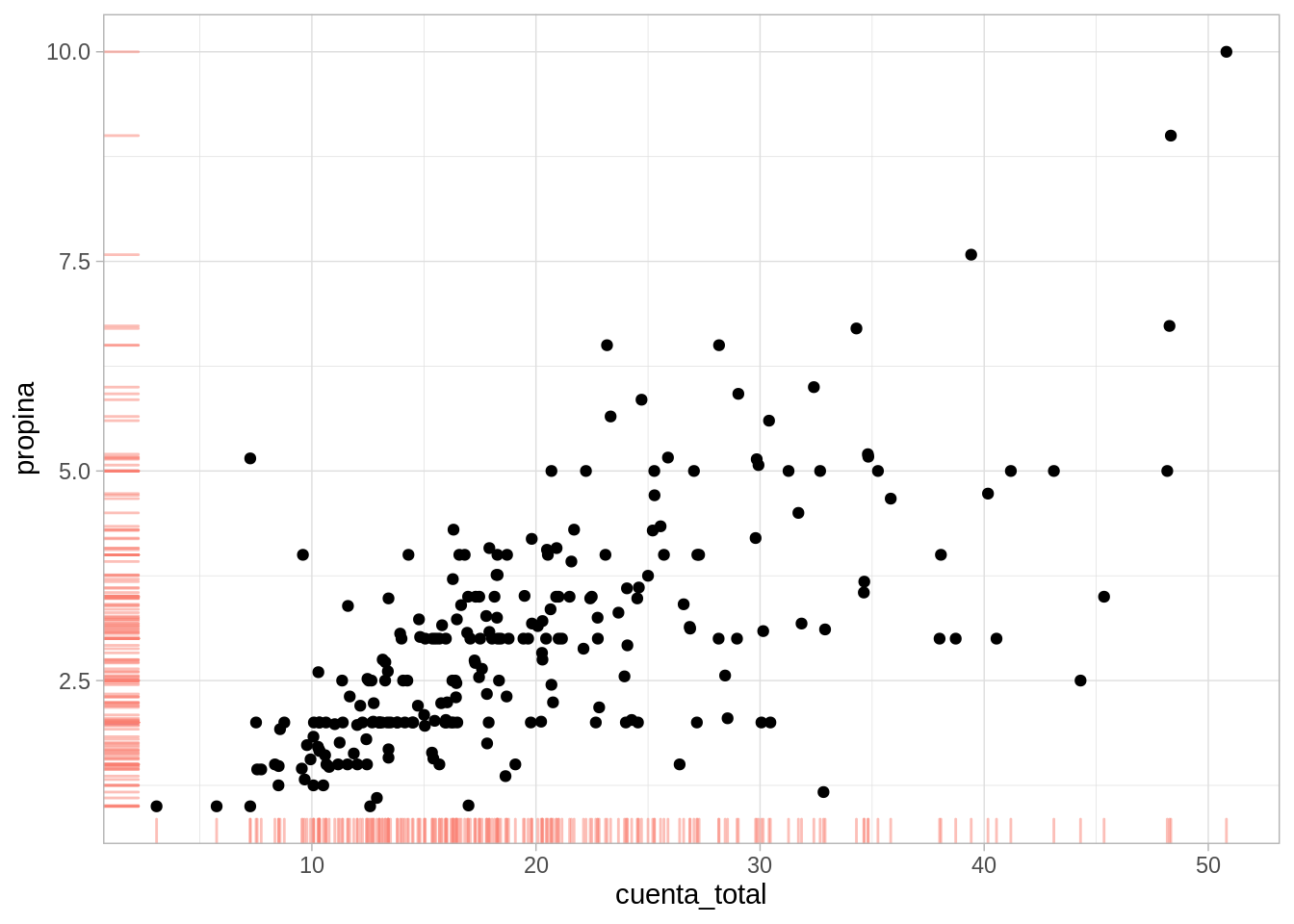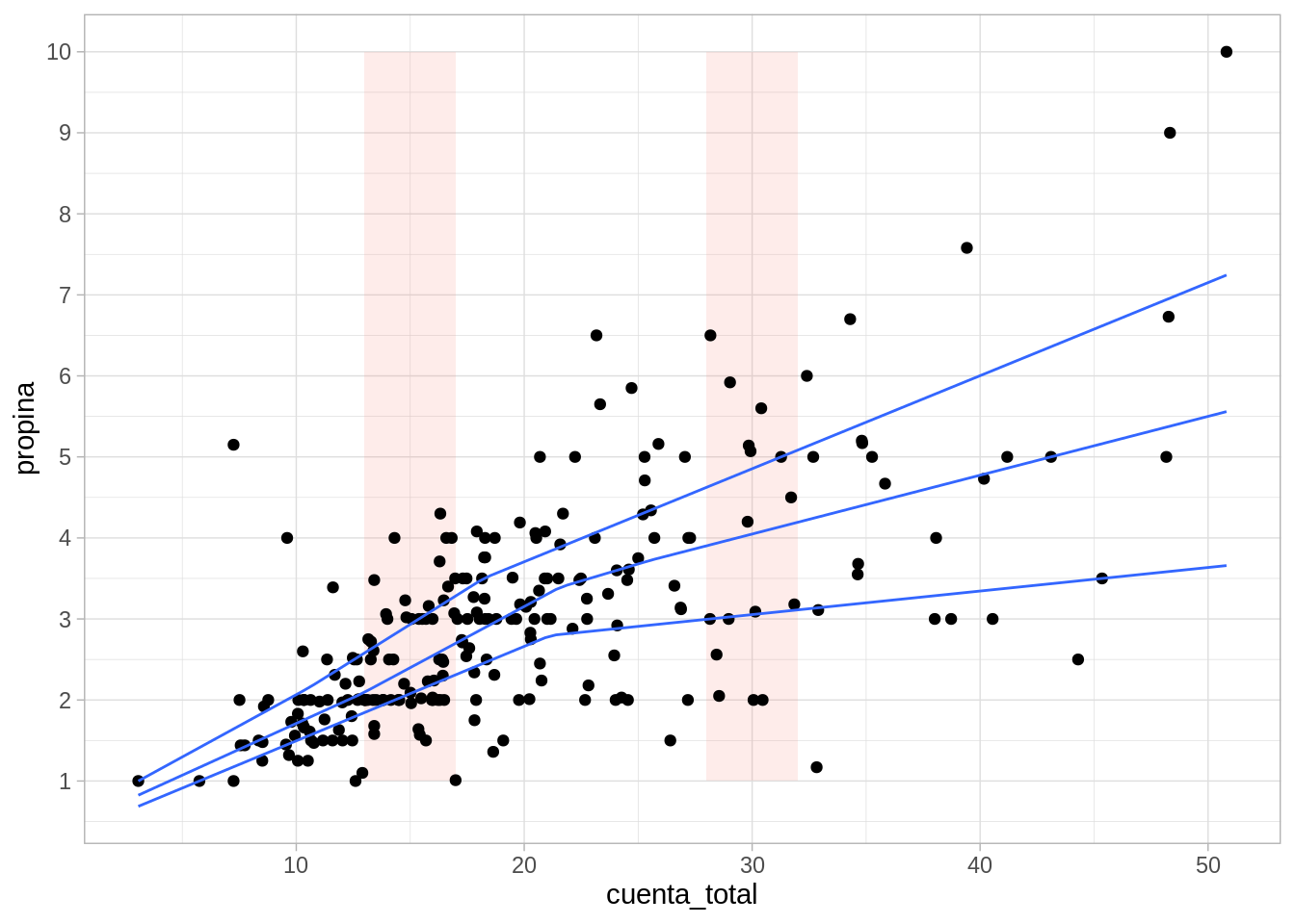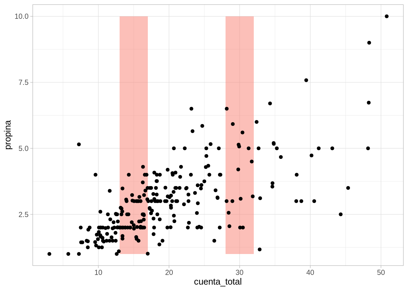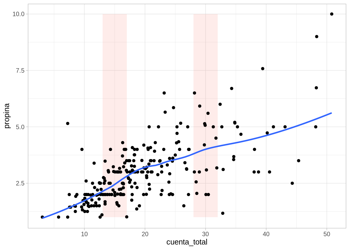 ggplot(propinas, aes(x = cuenta_total, y = propina)) +geom_ribbon(aes(xmin =13, xmax =17), fill ="salmon", alpha =0.15) +geom_ribbon(aes(xmin =28, xmax =32), fill ="salmon", alpha =0.15) +geom_point() +geom_smooth(method ="loess", span =0.5, degree=0, method.args =list(family ="symmetric"), se =FALSE)