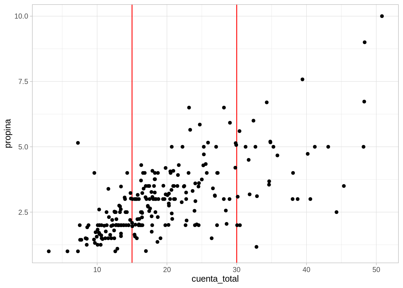Vemos que los datos de propinas alrededor de 30 dólares están centrados en valores más grandes que en el nivel de 15 dólares, y también que hay más dispersión en el nivel de 30 dólares. Sin embargo, vemos que tenemos un problema: existen realmente muy pocos datos que tengan exactamente 15 o 30 dólares de cuenta. La estrategia es entonces considerar qué sucede cuando la cuenta está alrededor de 15 o alrededor de 30 dólares, donde alrededor depende del problema particular y de cuántos datos tenemos: