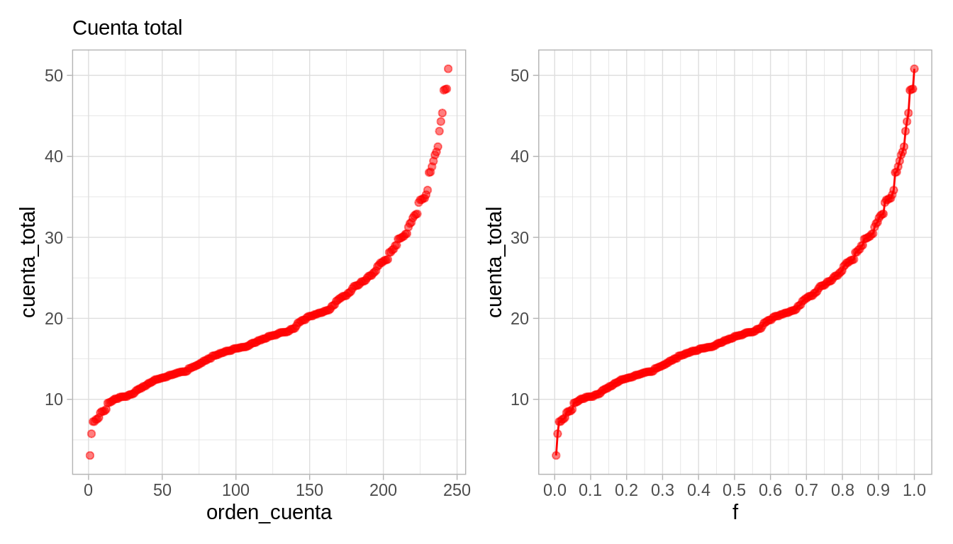A esta función le llamamos la función de cuantiles para la variable cuenta total. Nos sirve para comparar directamente los distintos valores que observamos los datos según el orden que ocupan.