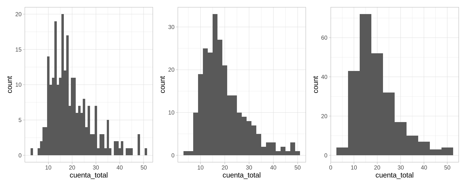 En algunos casos, es más natural hacer un histograma, donde dividimos el rango de la variable en cubetas o intervalos (en este caso de igual longitud), y graficamos cuántos datos caen en cada cubeta. En la siguiente gráfica variamos el ancho de las cubetas: