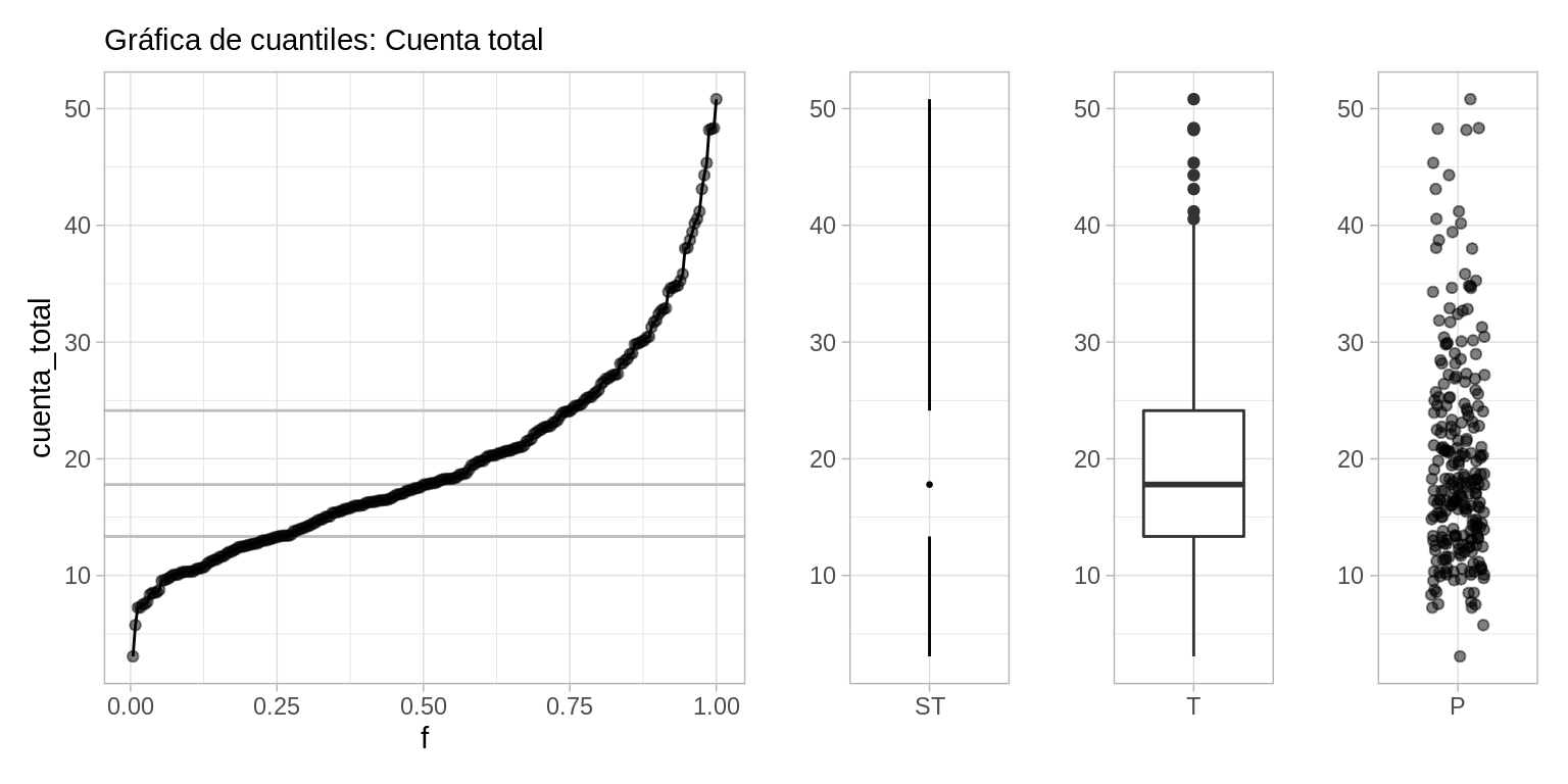 Nota: si los datos originales son \(y_1, y_2, \ldots, y_n\), y los mismos datos ordenados son \(y_{(1)}, y_{(2)}, \ldots, y_{(n)}\), entonces si \(f= j/n\), \(q(f) = y_{(j)}\). Si \(f\) toma un valor intermedio entre \((j-1)/n\) y \(j/n\), entonces interpolamos \(y_{(j-1)}\) y \(y_{(j)}\) para encontrar \(q(f)\).