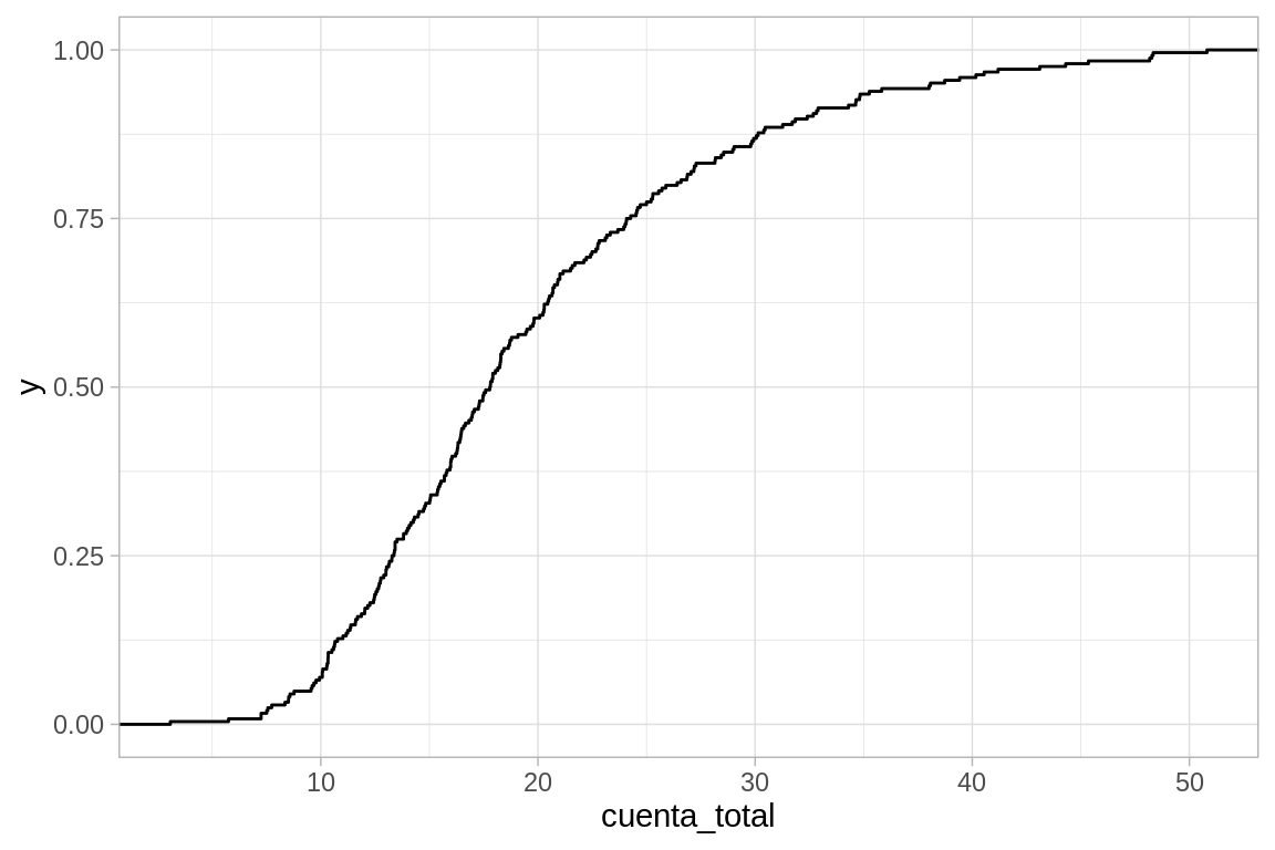 En esta gráfica, vemos que proporción de los datos que son iguales o están por debajo de cada valor en el eje horizontal.