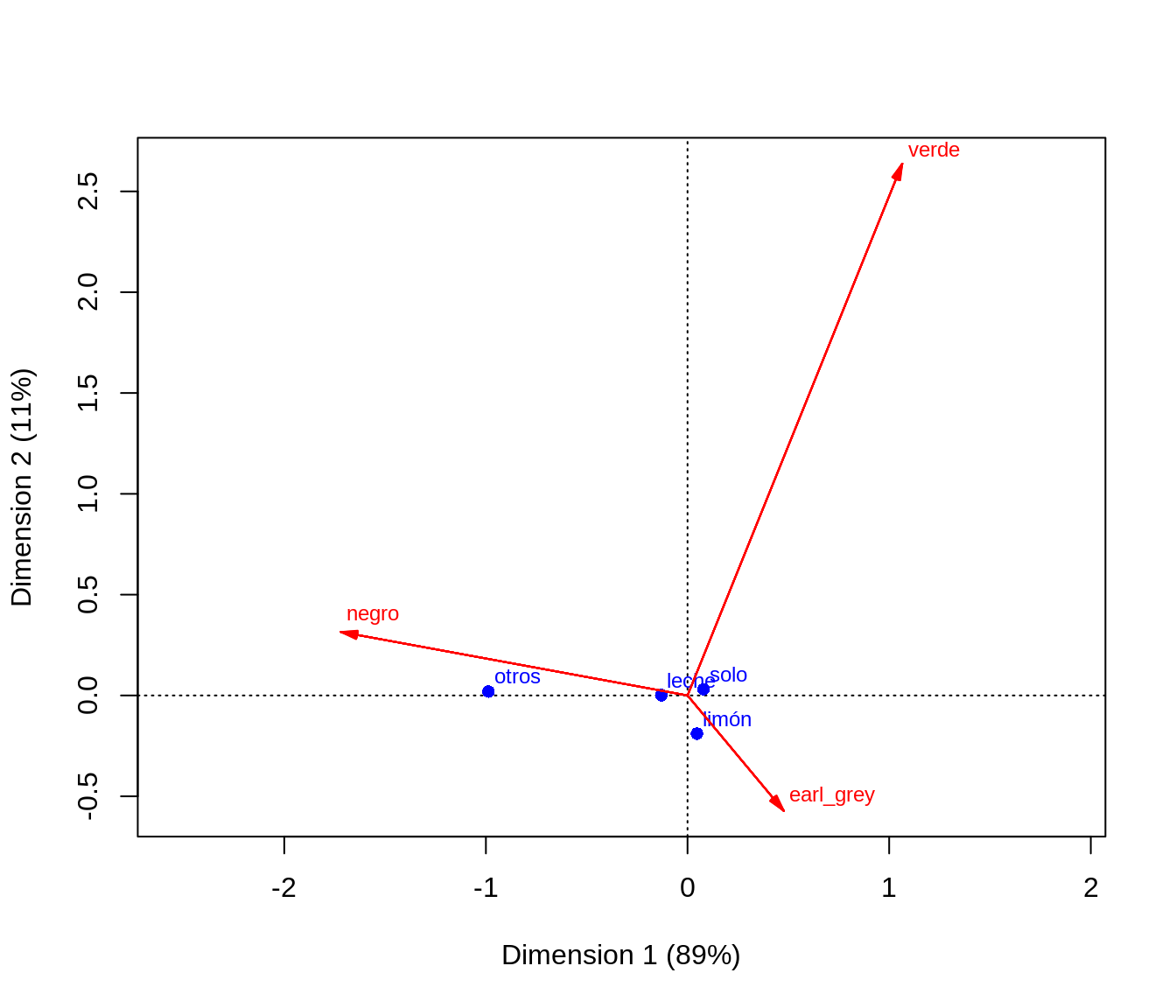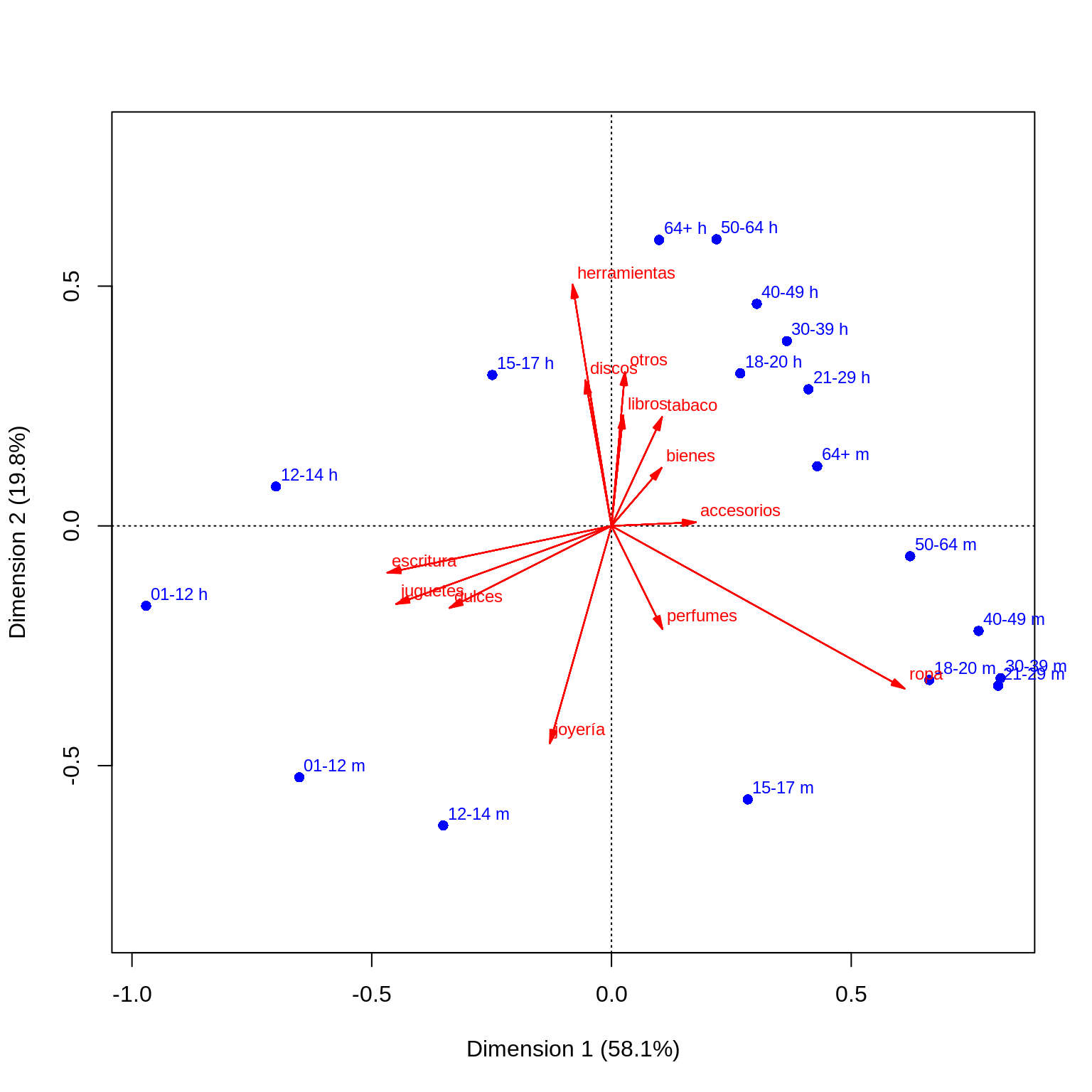 Nota adicionalmente que el ordenamiento de las categorías en la primera dimensión del mapa de correspondencias ayuda a interpretar:
