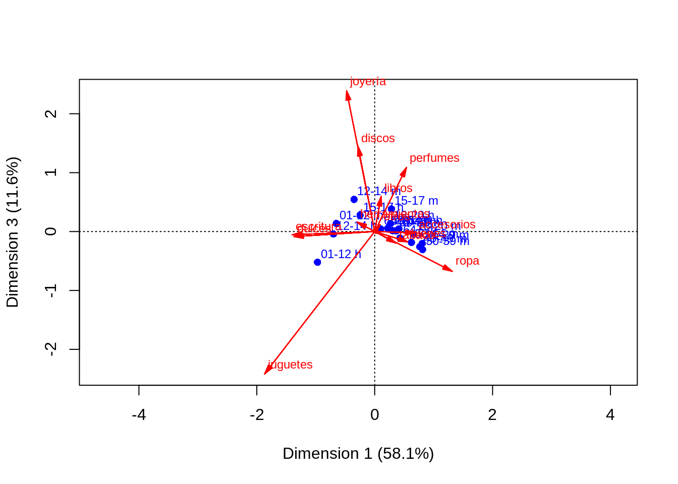 plot(corr_hurto, dim = c(1, 3), map = "rowprincipal", arrows = c(FALSE, TRUE))