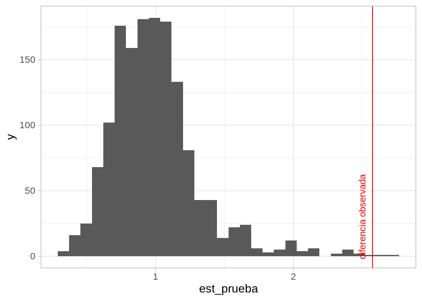 label = "diferencia observada", colour = "red", angle = 90)`stat_bin()` using `bins = 30`. Pick better value with `binwidth`.