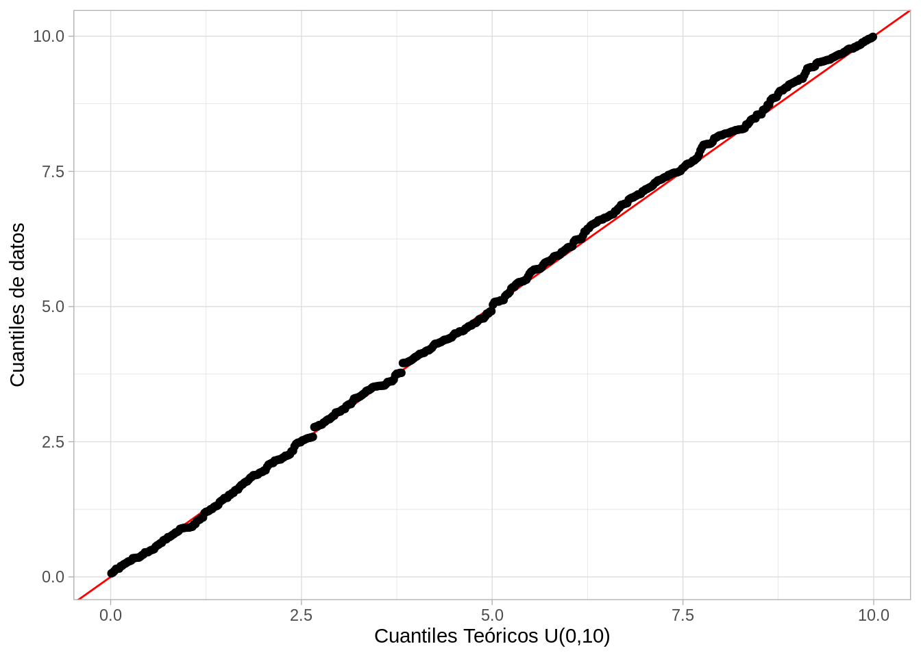 Por el ejercicio anterior sabemos cuáles son los cuantiles teóricos correspondientes a una uniforme en \([0,10]\). Podemos calcularlos también como sigue: