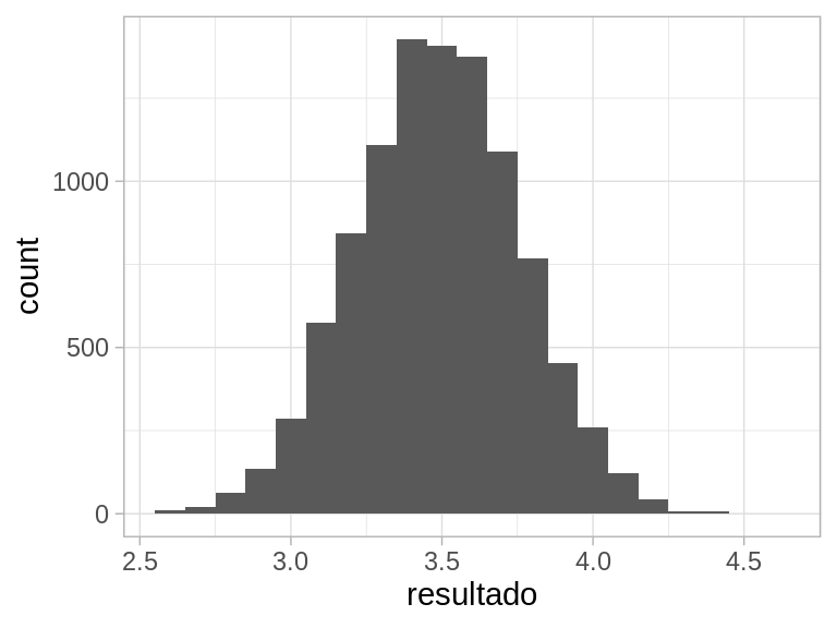 simular_bolsa <-function(num_dados =40){ dados <-sample(1:6, num_dados, replace =TRUE) media <-mean(dados) media}simular_bolsa()