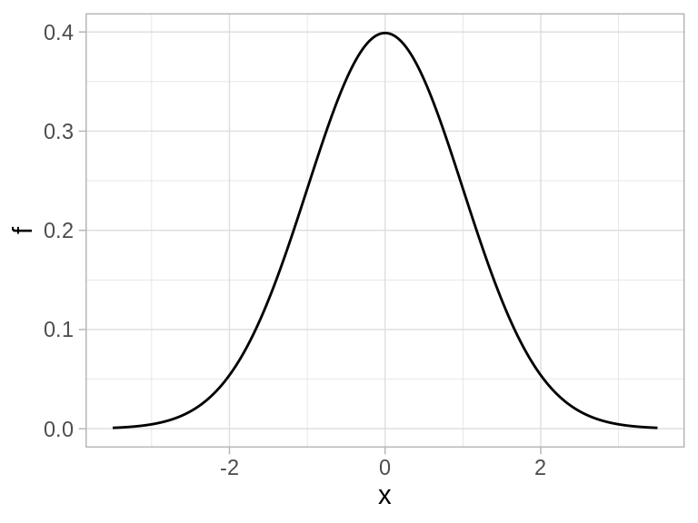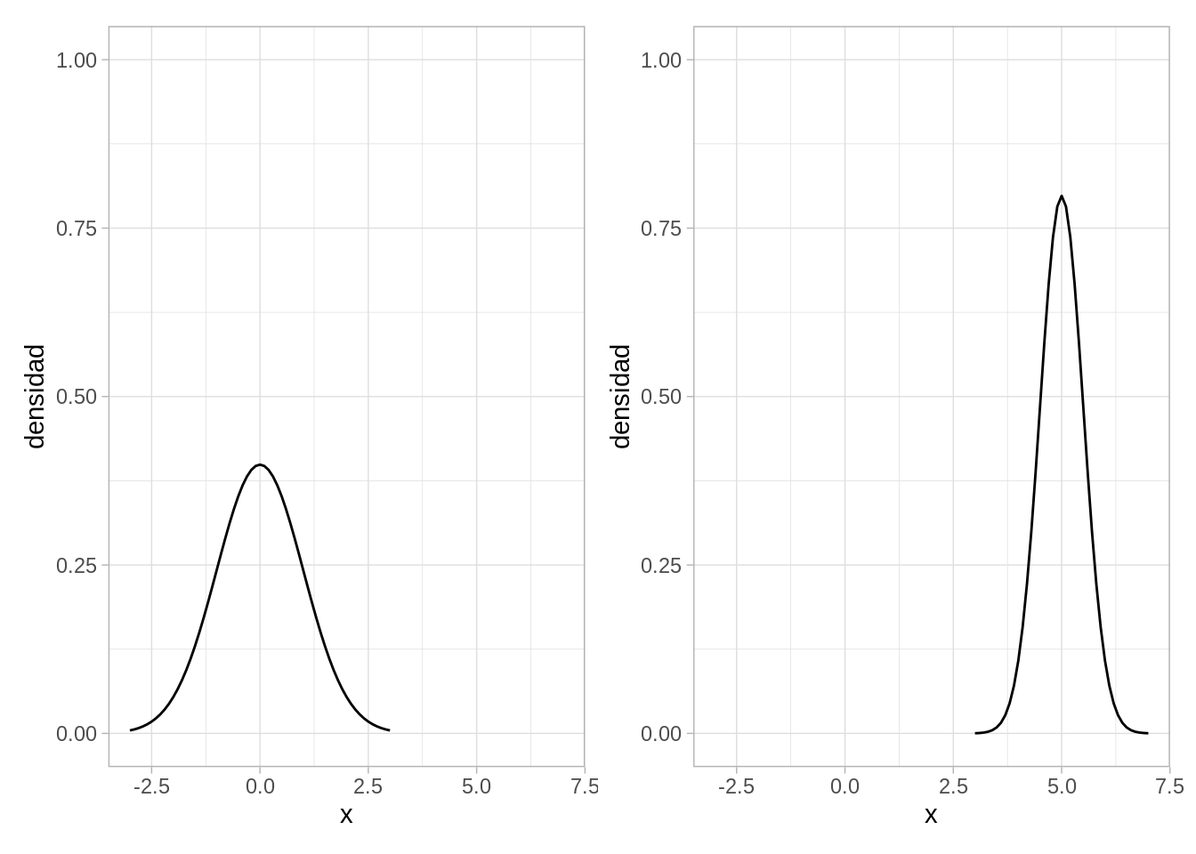 Esta es la forma de la densidad estándar. Podemos centrar esta campana en otro valor \(\mu\) y aumentar la dispersión por un factor \(\sigma\). Si \(Z\) es una variable normal estándar, la variable