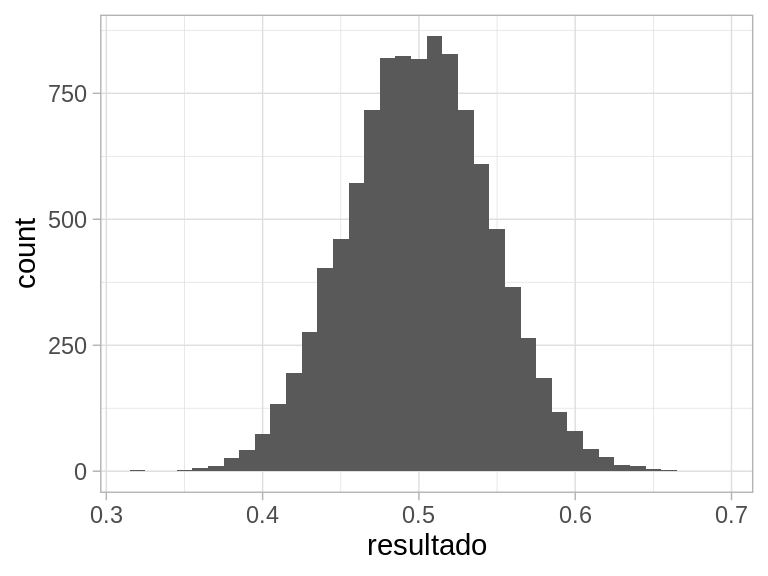 Veamos cómo se ven los resultados si hacemos este experimento un número grande de veces: