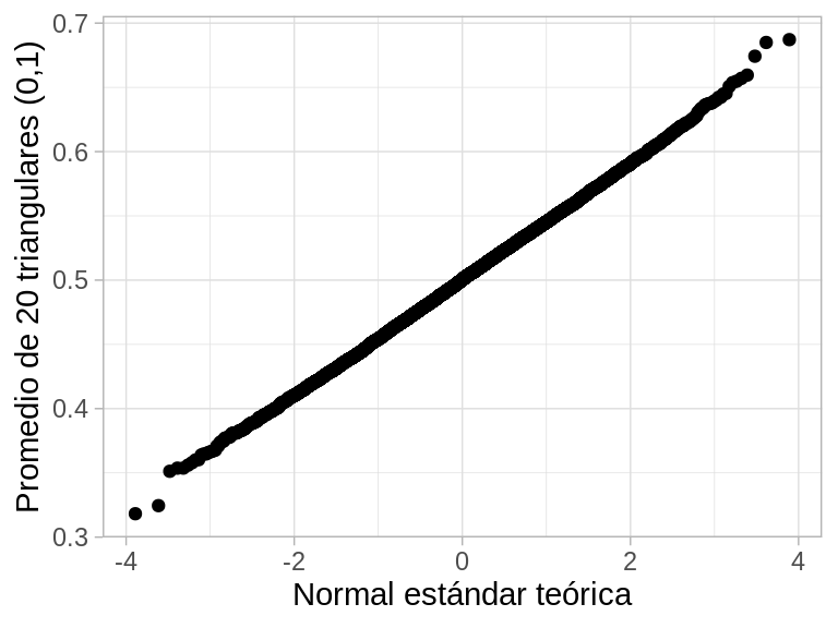 Probemos con promedios de 20 observaciones triangulares en \((0,1)\) por ejemplo. El resultado es el mismo: