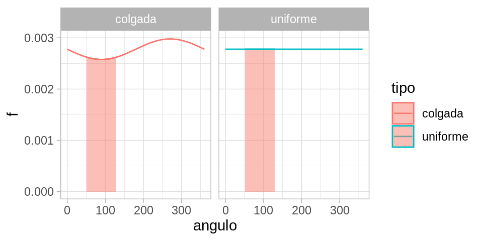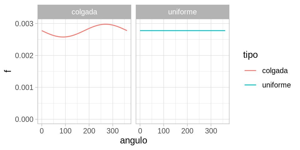 f_dens <-function(x){ x_rad <-2* pi * x /360 (1/360) +0.0002*cos(x_rad -3* pi /2)}graf_1_tbl <-tibble(angulo =seq(0, 360, 1), tipo ="uniforme",f =1/360) graf_2_tbl <-tibble(angulo =seq(0, 360, 1), tipo ="colgada") %>%mutate(f =f_dens(angulo))graf_tbl <-bind_rows(graf_1_tbl, graf_2_tbl)ggplot(graf_tbl, aes(x = angulo, y = f, colour = tipo)) +geom_line() +ylim(c(0, 0.003)) +facet_wrap(~tipo, nrow =1)