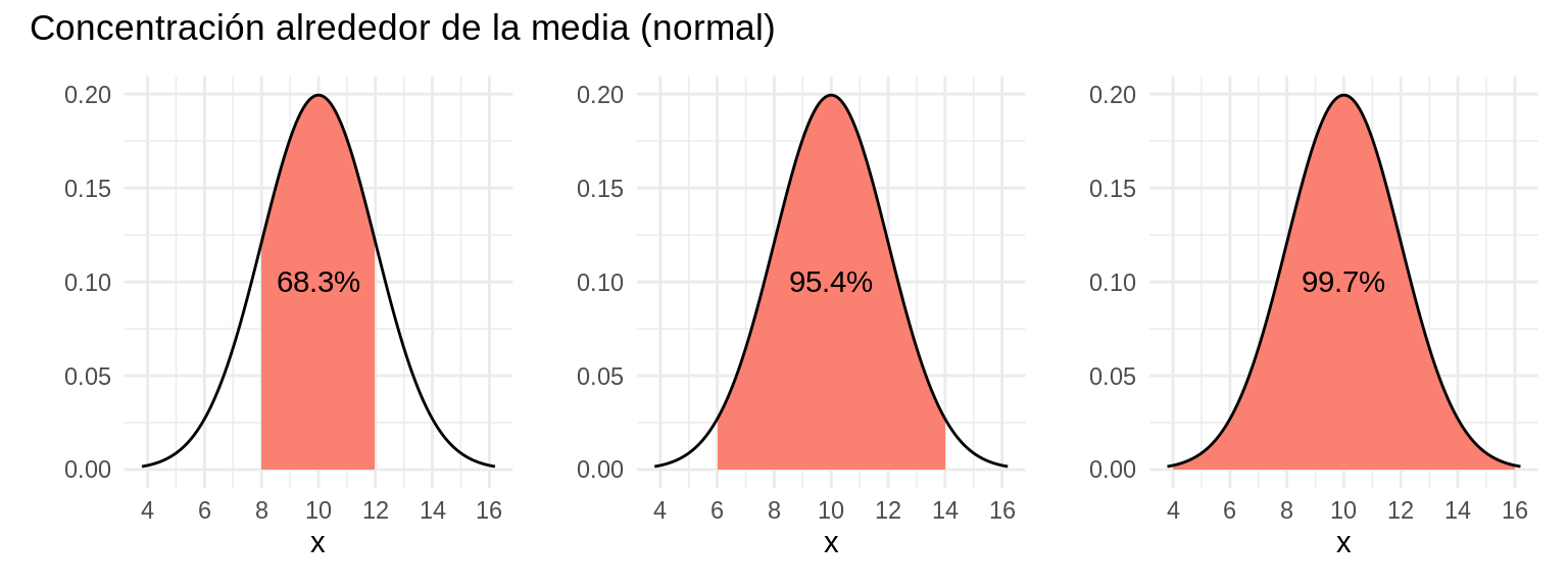grafica_concentracion <-function(mu, sigma, z){ x <-seq(mu -3.1* sigma, mu +3.1* sigma, 0.01) valor <-dnorm(x, mu, sigma) datos <-tibble(x = x, `f(x)`=valor) texto <-round(100*(pnorm(z) -pnorm(-z)), 1) texto <-paste0(texto, "%")ggplot(datos, aes(x = x, y =`f(x)`)) +geom_area(data =filter(datos, x < mu + z*sigma, x > mu - z*sigma), fill ="salmon") +geom_line() +annotate("text", x = mu, y =0.1, label = texto) +scale_x_continuous(breaks = mu + sigma*seq(-3, 3, 1)) +theme_minimal() +ylab("") }g_68 <-grafica_concentracion(10, 2, 1)g_95 <-grafica_concentracion(10, 2, 2)g_997 <-grafica_concentracion(10, 2, 3)paneles <- g_68 + g_95 + g_997paneles +plot_annotation(title ="Concentración alrededor de la media (normal)")