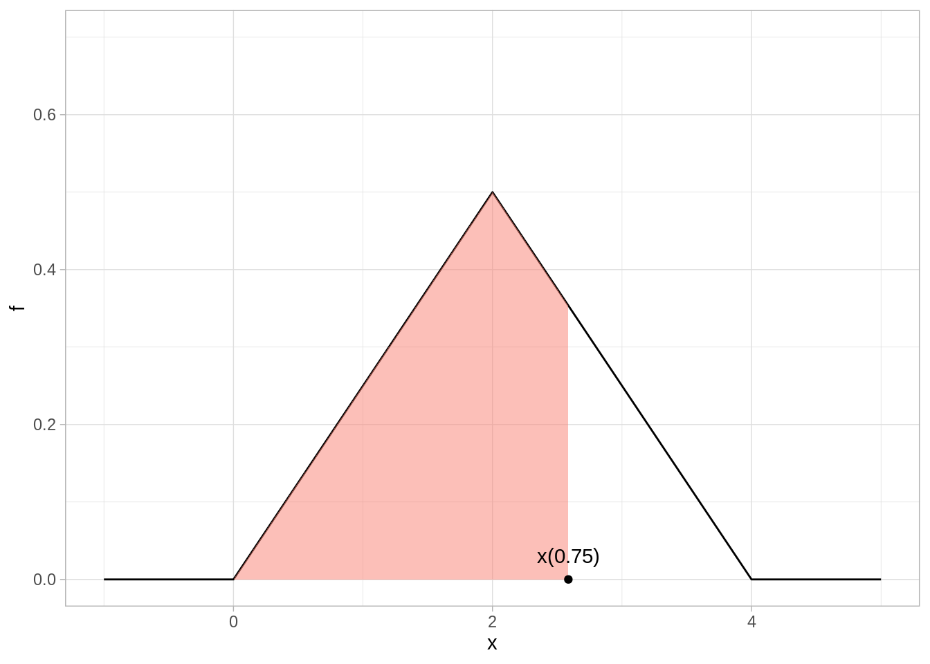 source("R/triangular.R")ggplot(triangular_tbl, aes(x = x, y = f)) +geom_line() +geom_area(aes(x =ifelse(x >0& x <qtri(0.75, 0, 4), x, 0)), fill="salmon", alpha =0.5) +ylim(c(0, 0.7)) +annotate("text", x =qtri(0.75, 0, 4), y =0.03, label ="x(0.75)") +annotate("point", x =qtri(0.75, 0, 4), y =0.0)