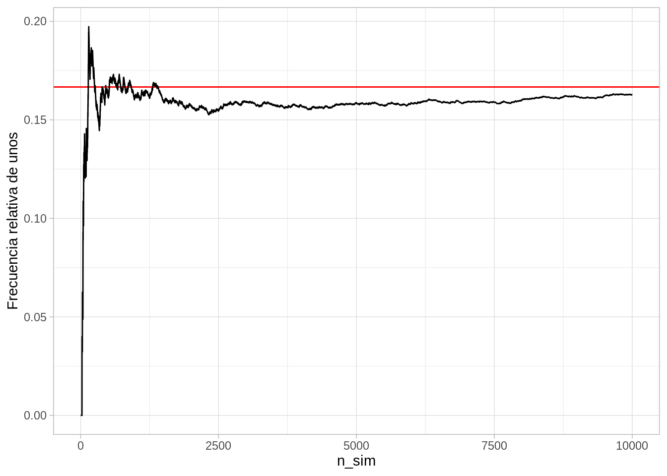 Y nuestro modelo teórico (resultados equiprobables) coincide razonablemente bien con las frecuencias observadas a largo plazo. Podemos ver cómo convergen las frecuencias relativas por ejemplo del resultado 1: